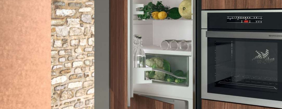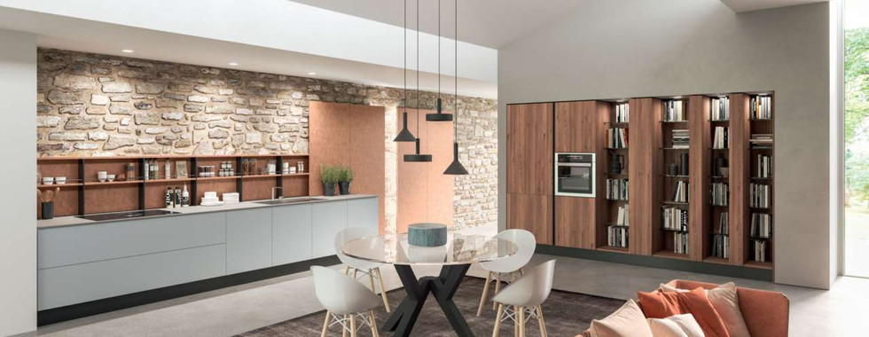 L’unità a parete,definita da moduli essenziali con ante push-pull, ospita il piano di lavoro in HPL stratificato argilla Cuore Colore, il lavello e il piano cottura. Lo schienale Copernico, proposto nella stessa finitura dei pensili e impreziosito da dettagli in alluminio nero, si rivela come pratica soluzione salva spazio per far posto a tutto ciò che è utile avere sempre a portata di mano. Ancora, le colonne ospitano gli elettrodomestici e una serie di mensole in vetro, ideali come eleganti ripiani a giorno.