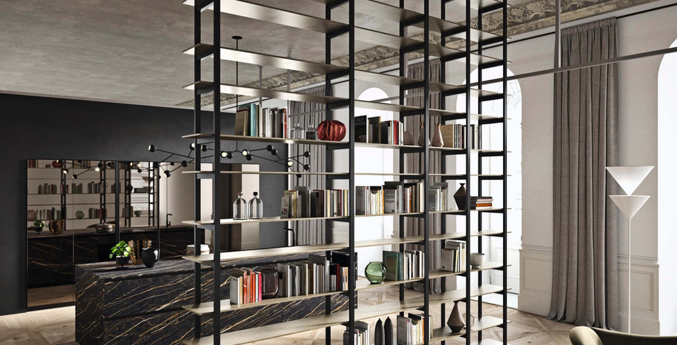 "Filtri" perfetti tra la cucina, la zona pranzo e il living, le nuove librerie "centro stanza" assolvono la funzione di connettere tra loro gli ambienti con la massima libertà e con il minimo ingombro.